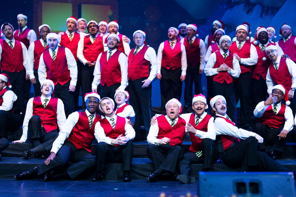 Standout performances includeded the traditional crowd favorite Parade of the Wooden Soldiers, featuring Matthew Ambrosen, Scott Archer, Drew Hedges, Patrick Kuntz, Jared McElroy, Edric Mitchell, Matty Rohrer, Jacob Tribby, and Chase Wagner. Other highlights included a medley of Back Home Again in Indiana / Indiana Christmas, with Gregory offering an organ solo on the former and Steve Beebe and Tim Luczak shining on the latter; and Dear Santa (Bring Me a Man This Christmas) / It’s Raining (Snowing) Men, featuring Matthew Altman and Matty Rohrer as the Weather Girls, along with Matthew Ambrosen, Josh Harrington, Marquist Henderson, Patrick Kuntz, Chase Wagner, Patrick Wagner, and the full chorus.