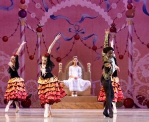 Worthy of note in the Act 2 divertissements was Glen Moretta as Mother Courage, who skillfully navigated his character’s immense gown from which the Polichinelles emerged. An absorbing performance was that of Brigette Duffin as the Marzipan Lead and the Marzipan dancers themselves. They included Elaina de Fonte, Naya Nara, Macyn Vogt, and Elaina de Fonte.